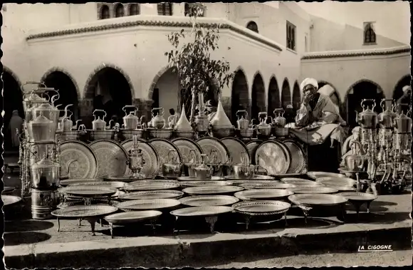 Ak Marokko, Maroc, Scènes et Types, Marchand de cuivre, Händler, Geschirr aus Kupfer