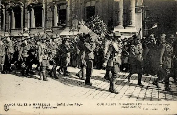 Ak Marseille Bouches du Rhône, Nos Allies, Defile d'un Regiment Australien
