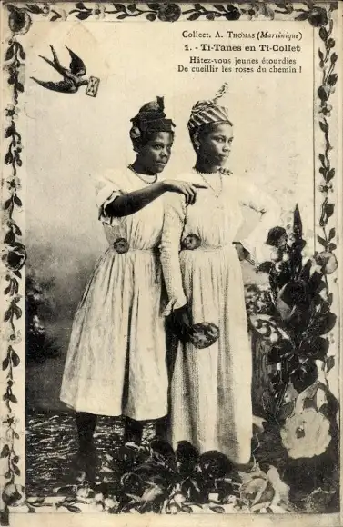Ak Martinique, Zwei Frauen in Trachten, Blumen, Schwalbe