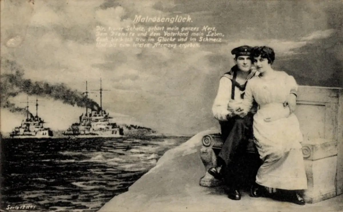 Ak Matrose in Uniform mit Frau, Kriegsschiffe