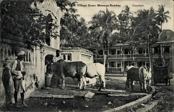 Ak Matunga Mumbai Bombay Indien, Dorfszene, Inder mit Ochsen am Brunnen