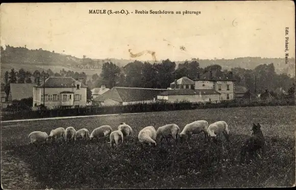 Ak Maule Yvelines, Brebis Southdown au paturage, Schafherde mit Hund
