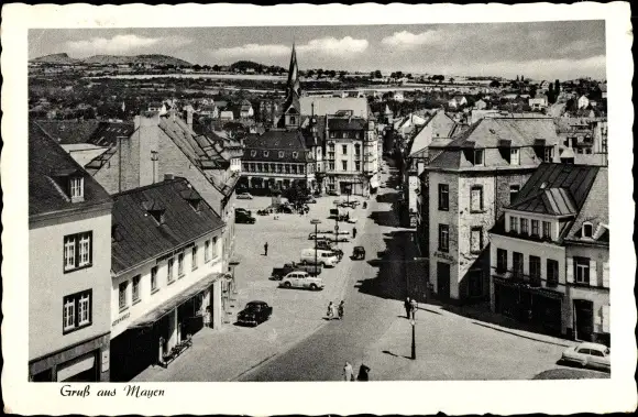 Ak Mayen in der Eifel, Straßenpartie, Kirchturm, Parkplatz, Geschäfte