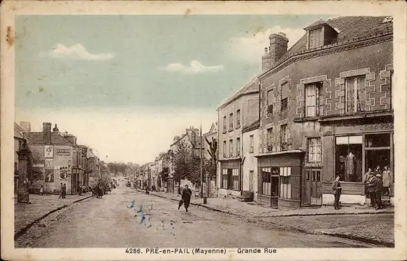 Ak Mayenne Stadt, Straße mit Gebäuden, Menschen, Werbeanzeigen, Geschäft, cloudy sky