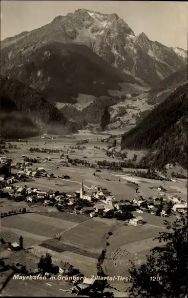 Ak Mayrhofen Tirol, Panorama, Ort im Tal, Grünberg