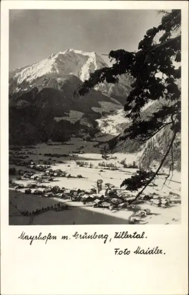 Ak Mayrhofen im Zillertal Tirol, Gesamtansicht im Winter, Grünberg