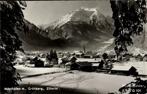 Ak Mayrhofen im Zillertal Tirol, Panorama, Grünberg, Winter