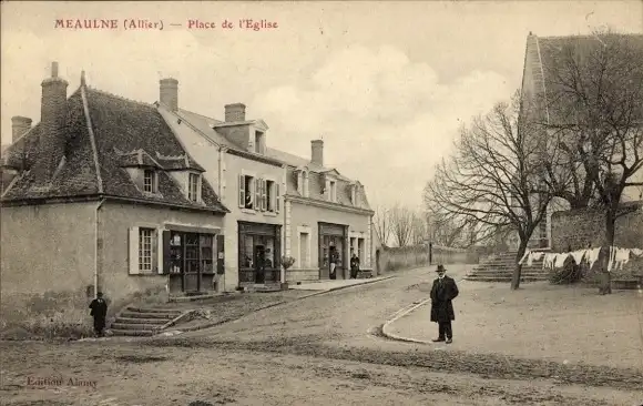 Ak Meaulne Allier, Platz der Kirche, Häuser, Person, ländliche Szene