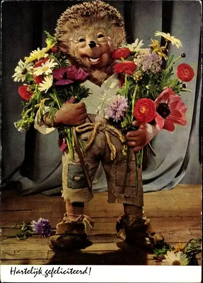 Ak Mecki der Igel, Blumenstrauß, Herzlichen Glückwunsch