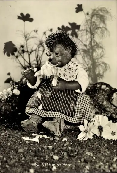 Ak Mecki der Igel, Er liebt mich doch, Igelfrau zupft Blütenblätter von Blumen