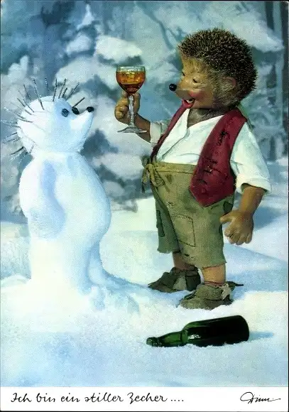 Ak Mecki der Igel, Ich bin ein stiller Zecher, Schneemann, Weinglas