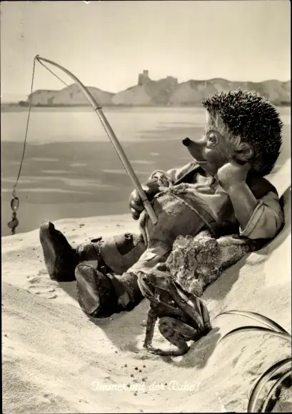 Ak Mecki der Igel, Immer mit der Ruhe, Mecki beim Angeln, Frosch