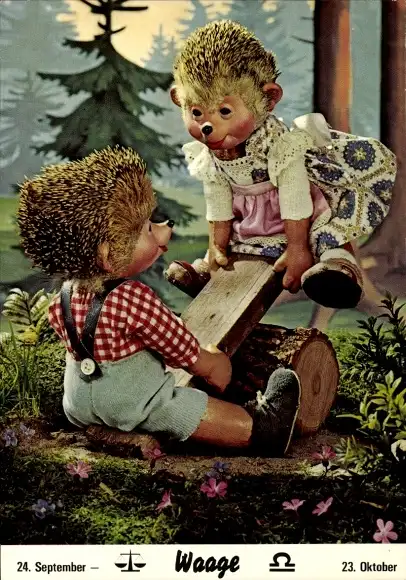 Ak Mecki der Igel, Sternzeichen Waage, Libra, 24. September bis 23. Oktober, Igelkinder auf Wippe