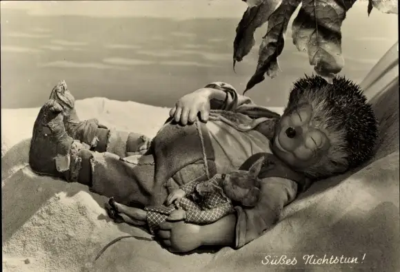 Ak Mecki der Igel, Süßes Nichtstun, schlafender Igel mit Maus