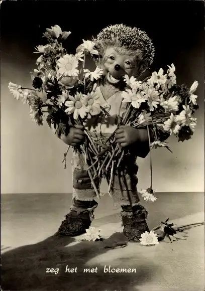 Ak Mecki der Igel mit Blumen, zeg het met bloemen