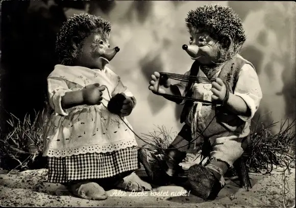 Ak Mecki der Igel und Igelin rollen Wolle auf, Alte Liebe rostet nicht