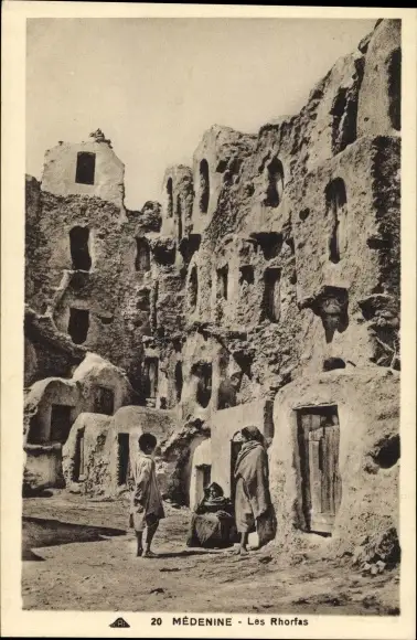 Ak Medenine Tunesien, Les Rhorfas, Wohngebäude, Personen