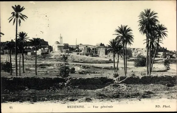 Ak Médenine Tunesien, Vue generale, Blick auf den Ort, Minarett, Palmen