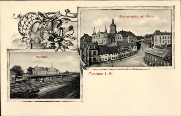 Ak Meerane in Sachsen, Bahnhof, Bismarckplatz, Kirche
