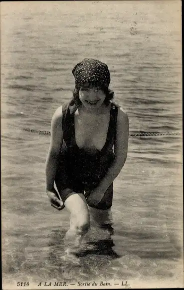 Ak Meerespartie, Frau in Badeanzug verlässt das Meer
