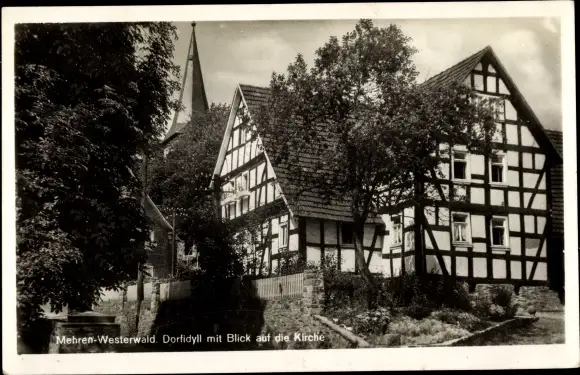 Ak Mehren im Westerwald, Blick auf die Kirche, Fachwerkhaus