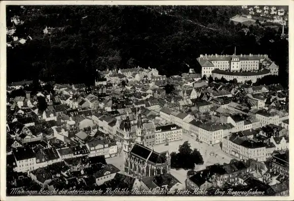 Ak Meiningen in Südthüringen, Fliegeraufnahme der Innenstadt, Kirche, Marktplatz