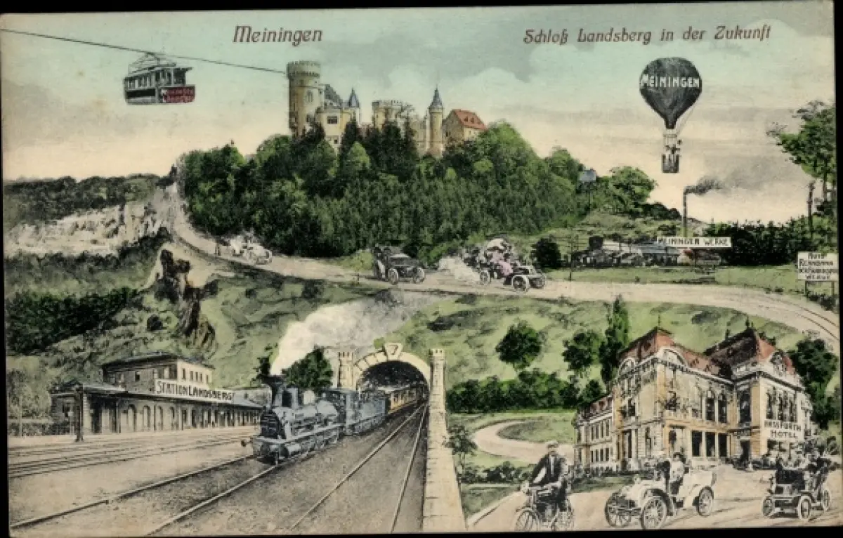 Ak Meiningen in Thüringen, Schloss Landsberg in der Zukunft, Ballon, Seilbahn, Bahnhof