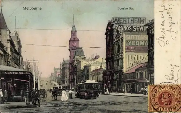 Ak Melbourne Australien, Bourke Str., Straßenbahn