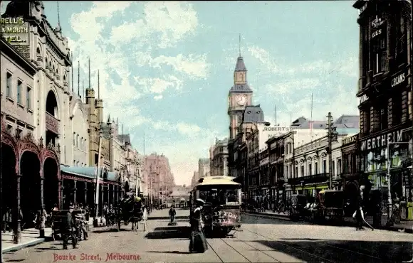 Ak Melbourne Australien, Bourke Street, Straßenpartie, Straßenbahn