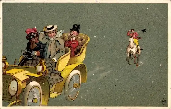 Ak Menschen im Automobil, Frau an Lenkrad, Mann zu Pferde