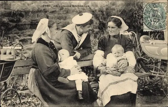 Ak Menschen in bretonischer Tracht, Frauen mit Babys, Mann in Uniform