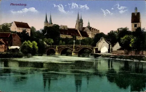 Ak Merseburg an der Saale, Teilansicht, Saale, Brücke, Schloss, Kirche