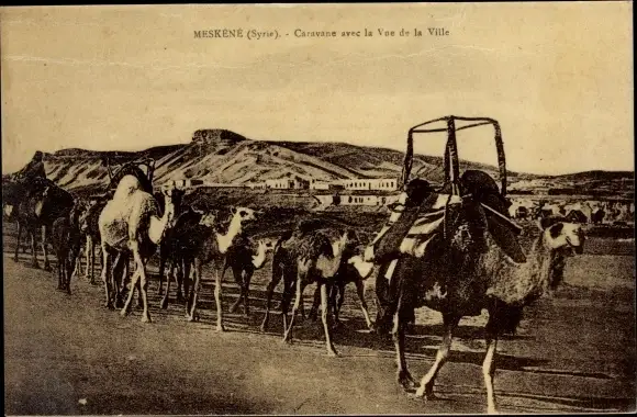 Ak Meskéné Syrien, vue d'une Caravane avec la Vue de la Ville, Chameaux