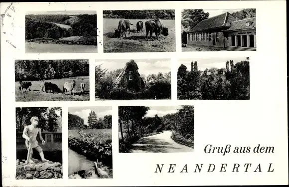 Ak Mettmann, Neandertal, Panorama, Statue, Pferdekoppel, Bisente