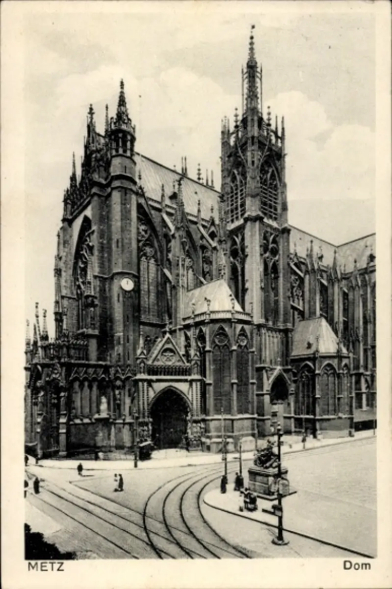 Ak Metz Moselle, Dom in schwarz-weiß, Uhr, Straßenbahn, Menschen