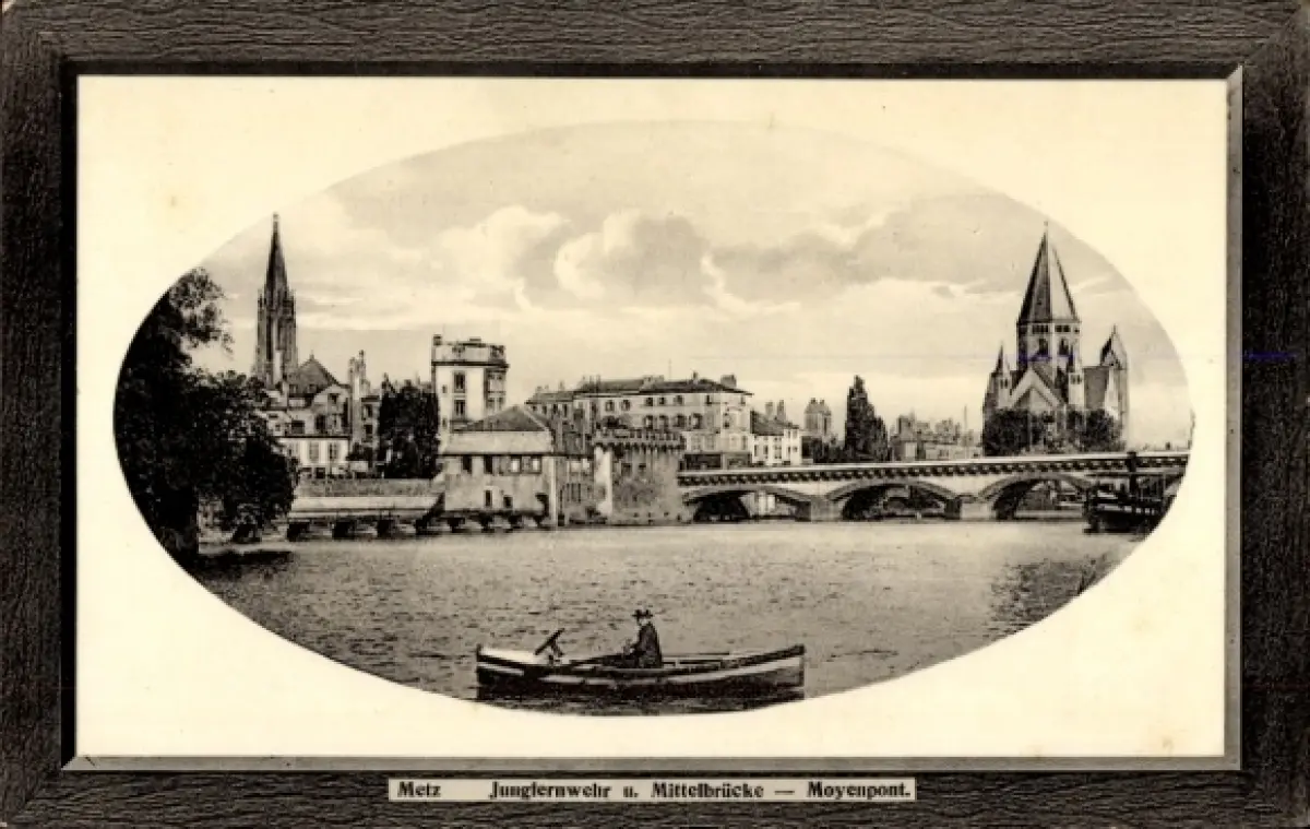 Ak Metz Moselle, Jungfernwehr, Mittelbrücke, Fluss, Boot