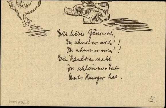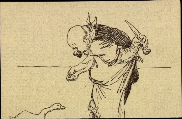 Ak Metzger mit Messer will Gans schlachten, lieber Gänserich, du ahnst es nich, ein Raubtier naht