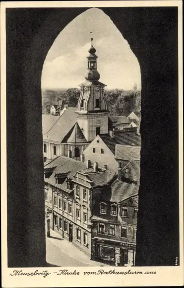 Ak Meuselwitz in Thüringen, Kirche vom Rathausturm aus, Geschäft Heinemann