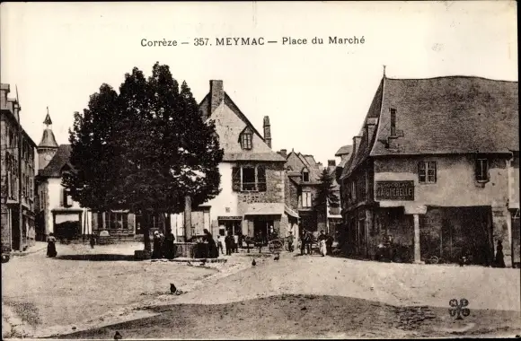 Ak Meymac Correze, Place du Marché, Chocolat d'Aiguebelle