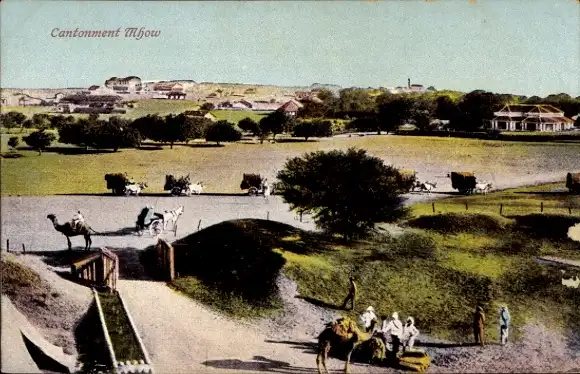 Ak Mhow Indien, Gesamtansicht, Kamele