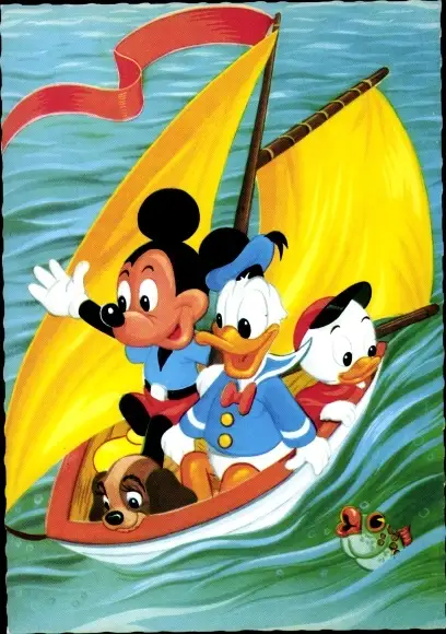 Ak Micky Maus, Donald Duck, Segelboot, Walt Disney