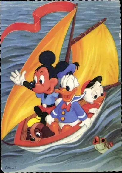 Ak Micky Maus, Donald Duck, Segelboot, Walt Disney