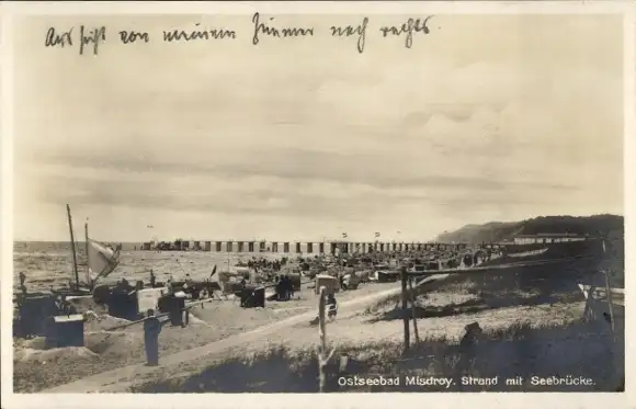 Ak Międzyzdroje Ostseebad Misdroy Pommern, Ostseebad Strand mit Seebrücke, Schiffe, Menschen, Se