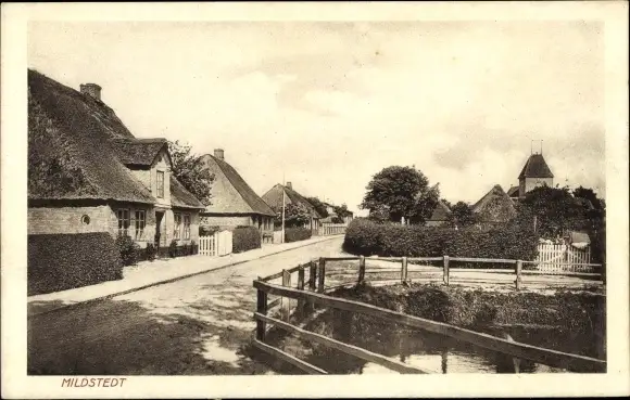 Ak Mildstedt in Nordfriesland, Straßenpartie im Ort, Reetdachhäuser