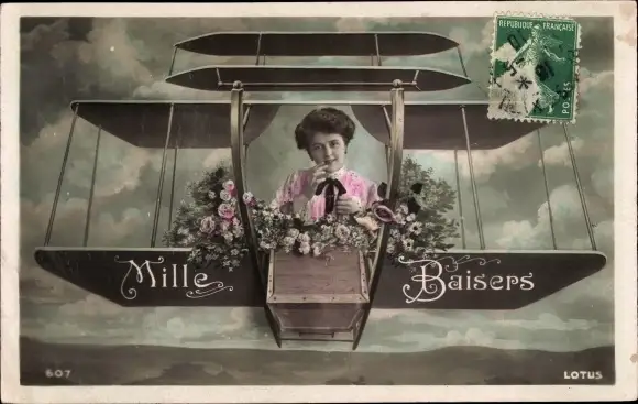 Ak Mille Baisers, Frau in einem Flugzeug, Fotomontage, Doppeldecker