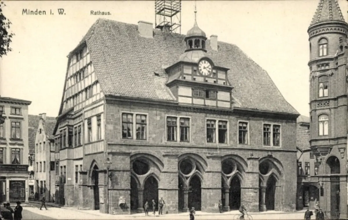 Ak Minden in Westfalen, Rathaus, Architektur, Uhr, Fachwerk, Straßenansicht