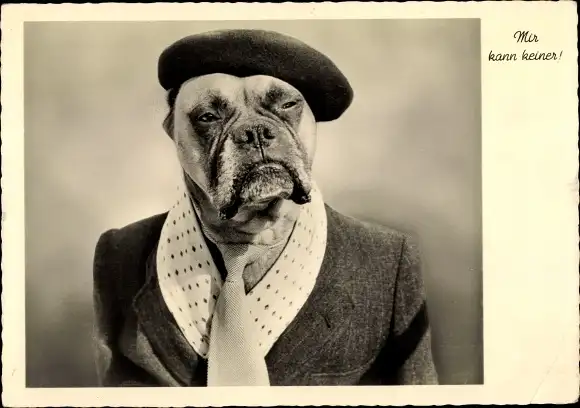 Ak Mir kann keiner, vermenschlichter Hund, Bulldogge im Anzug