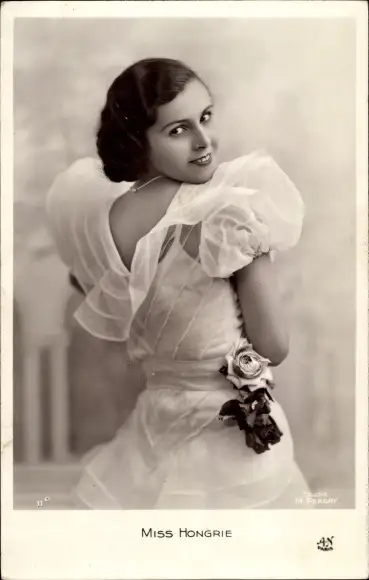 Ak Miss Ungarn, Frau in weißem Kleid, Portrait, Rose