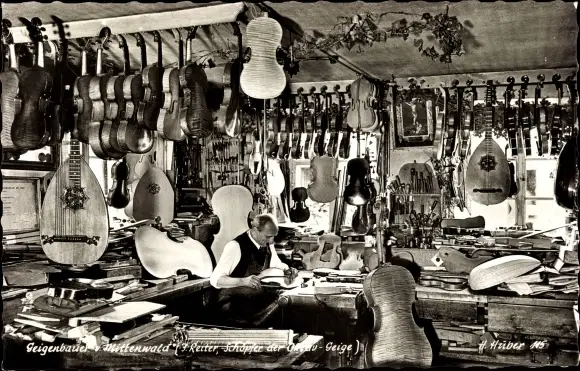 Ak Mittenwald in Oberbayern, Geigenbau, J. Reiter, Schöpfer der Urgeige