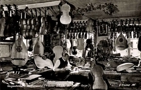 Ak Mittenwald in Oberbayern, Geigenbau, J. Reiter, Schöpfer der Urgeige